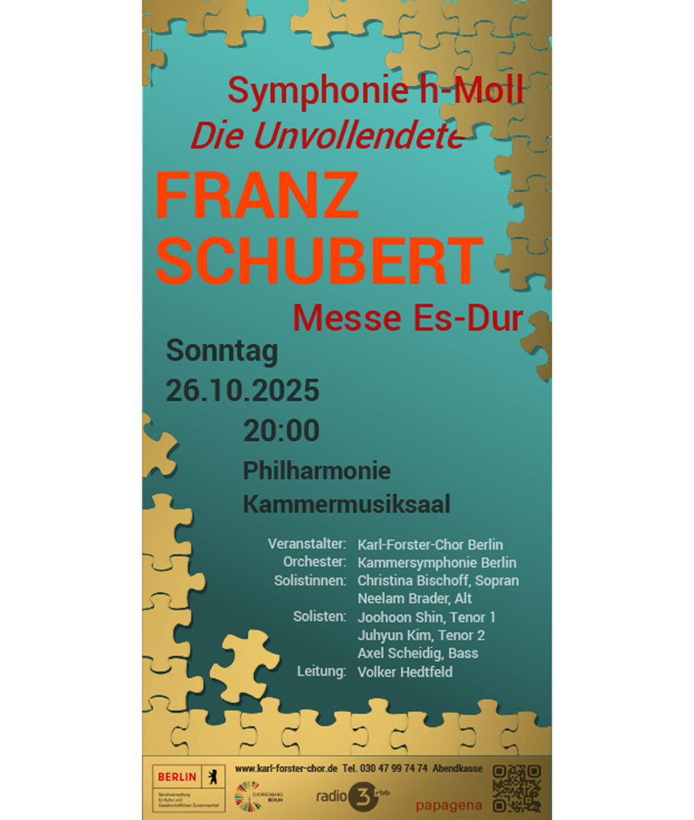 Erleben Sie die unvergängliche Schönheit der Musik Franz Schuberts in einem außergewöhnlichen Konzertabend. Auf dem Programm stehen zwei seiner bedeutendsten Werke: die geheimnisvolle „Unvollendete“, Sinfonie in h-Moll und die majestätische Messe in Es-Dur, ein Meisterwerk geistlicher Musik voller Gefühl und Tiefe. Lassen Sie sich von Schuberts eindrucksvoller Klangsprache berühren – eine musikalische Hommage an einen der größten Romantiker aller Zeiten.